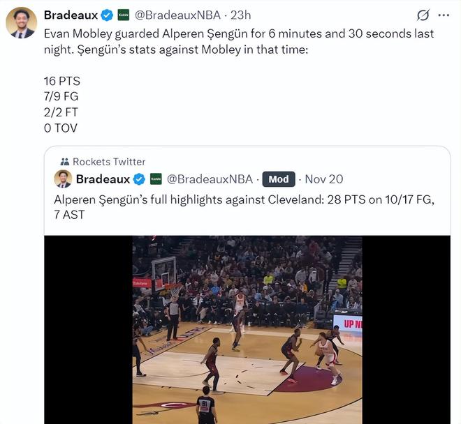火箭队击败了骑士队。沉静9罚7中,对阵DPOY专家埃文·莫布里2罚2中拿下16分,零失误。可以说,冷静战胜了莫布里。值得一提的是,莫布里是2021届的第16顺位新秀。(莫布里的薪水最高;沉静五年薪1.85亿。)去年夏天,莫布里在骑士队达到五年顶薪2.24亿美元。莫布里的合同增加到五年,价值2.69亿美元,他被评为全明星、第一阵容防守球员和年度最佳防守球员。本赛季的年薪为4639万日元,而鹿一的工资仅为3394万日元,相差接近1300万日元。火箭队记者布拉多写道:2021届最好的两名球员是活塞队的坎宁安和火箭队的沉静!坎宁安场均得到27.3分、5.4个篮板、9.9次助攻和2.4次抢断+盖帽我,投篮命中率53.5%,正负值+6.8,战绩10胜2负。沉静场均贡献23.4分10.4篮板7.4助攻2.2抢断+盖帽,以58%的命中率打出10胜3负的战绩,正负值+10.9。土耳其专家沉金进入联赛以来每个赛季都在不断进步。本赛季的进步更加明显。他的得分和助攻均创职业生涯新高,场均7.4次助攻。沉静的成长是火箭本赛季攻防实力的关键。将约基奇的数据与第五个赛季的数据进行对比,美国媒体StatMuse写道,约基奇场均贡献19.9分9.7篮板7助攻,三分命中率高达31.4%。沉静场均得到23.4分、10.4个篮板和7.4次投篮,三分球命中率高达44.7%。很明显,静香在同一时期超越了约基奇。本赛季,火箭队的击球阵容使用双塔的时间达到了38.5%e.沉静/亚当斯合计出战175分钟,占阵容时间的27.4%,净效率值为+15.4%。沉静/卡佩拉合计出战71分钟,占阵容时间的11.1%,净效率值为+3.5。随着杜兰特的加盟和神精的进化,火箭队实现了飞跃,进攻效率(ORTG)排名联盟第一。篮板球数(REB)排名第一。进攻篮板(OREB)排名第一。三分球命中率(3P%)排名第一。每场得分(PPG)排名第二。净效率(NETRTG)排名第三。