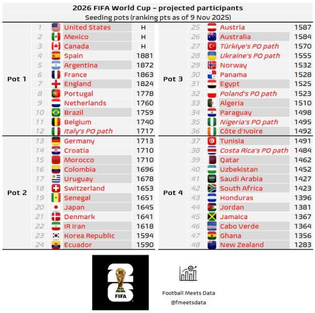 体坛周报全媒体记者李静宜足球遇见数据组织宣布美国、加拿大和墨西哥世界杯的规则发生重大变化。国际足联可以改变规则来确定晋级季后赛球队的级别。他们将不再被归为第四级。相反,每支球队将由国际足联在每个季后赛小组中排名最高的球队决定。如果转播商的消息属实,那么2026年世界杯的球队划分和组合将发生巨大变化。 2022年卡塔尔世界杯上,所有通过附加赛晋级正赛的国家队将统一参加第四级别联赛。如果美国、加拿大和墨西哥按照FIFA排名重新划分体重等级,意大利队(目前世界排名第九)将通过季后赛晋级路线升入第一梯队,而德国队(目前世界排名第十)则为红色降到第二级别,奥地利队则降级到第三级别。土耳其、乌克兰、波兰和尼日利亚四支球队以及一支进入附加赛的球队从第四级别升入第三级别,而突尼斯、卡塔尔、乌兹别克斯坦、沙特阿拉伯和南非的球队则降到第四级别。 2026年世界杯预选赛抽签将于11月20日在瑞士苏黎世国际足联总部举行。目前,有 28 支球队参加主赛事,另有 14 支球队在 11 月的国际比赛日通过各自的洲际预选赛晋级。剩下的22支球队将争夺最后6个季后赛席位。欧洲季后赛将由欧洲国家联赛中 12 支第二名和最好的四支球队组成。 16支球队将分为4个小组,进行半决赛和决赛,以单胜制的方式决出剩余的第四名。e 欧洲世界杯。为确保抽签规则得到遵守,国际足联将于11月19日更新世界排名并确定抽签标准。