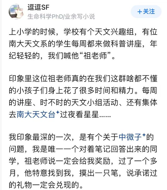 在我看来,我们应该如何对待我们的孩子,无论是上学的孩子还是没上学的孩子,其实是识别文明起源最重要的标签。我一直相信,以善意和善意对待孩子,他们就会身心健康成长,才能真正感恩社会,而不是怀有恶意。对此,我手头有这样一个感人的故事,想和大家分享。本文由知乎回答“豆豆SF”提交。我上小学的时候,在天文社认识了一位大学生,他给我讲课,还带我的孩子去天文台观星。二十年后,这个女孩终于找到了她当时大学天文系的学生。原来,他的名字叫祖英,现在是一名学者。这是典型学者祖英的近照。这是你的研究兴趣。他还参加了国际星系研究项目,该项目是认为是一个比较前沿的科学研究方向。当女孩得知当时的大学生已经成为一名学者时,她想了很多次,才鼓起勇气给他发了一封电子邮件。没想到朱女士在百忙之中抽出时间回复了这名女孩的邮件。终于,少女忍不住叹了口气。这是其他互联网用户共享的。读了祖英的故事后,我特别感动。 20年前,他对孩子们非常耐心、细心,至今仍记得对孩子们的承诺。可以说,你是一个散发着光明和温暖的人。你的存在给别人带来温暖和舒适的感觉。即使20年后,他仍然是一个非常友善的人,并且认真回复我的电子邮件。可以说,他是一个非常真诚的人。未曾见过的世俗之人,既没有不耐烦,也没有因为种种原因不再逃避。我可以说Soyoung教授的工作就是我研究的方向拱。因为自始至终他对孩子们都很友善,无微不至地照顾他们,引导他们走向更好的方向,给他们展示一个充满希望的世界。我也想对我的孩子们做同样的事情。其实在我看来,治疗孩子并不难。至少有足够的食物 给他们食物和衣服,这样他们就不会感到寒冷或饥饿。有了这个生活基础后,我们就送他们去学校,让他们接受适当的教育。不过,多读书对孩子还是有好处的。最后,永远尊重孩子的个性,耐心倾听他们的想法,包容他们,永远承认他们,鼓励他们做得更好。我相信,只有做好这些事情,才能真正为我们的孩子更好。实际上,这意味着孩子在生活和精神上都会正常发展。对heCho来说,全世界的母亲宁愿看到孩子甜美的笑容和温柔的声音,也不愿看到孩子孤独、泪流满面的样子。毕竟人心是身体饱满,每个人都希望自己的孩子过得好。祖英想了想,就这么做了。妈妈们也这么想,也这么做。这就是为什么我想分享祖英的故事。我想让我的朋友们明白什么是真正爱孩子。这并不是说每个孩子都可以成为祖印,这是不可能和不必要的,但显然,一个在爱和尊重中养育的孩子比一个被羞辱和虐待的孩子更有可能成为下一个祖印,更不用说养育了。如果你不穿保暖的衣服,无论你多么有才华,到了某个时候你也会崩溃。祖先多一点对国家和社会不是真的有好处吗?