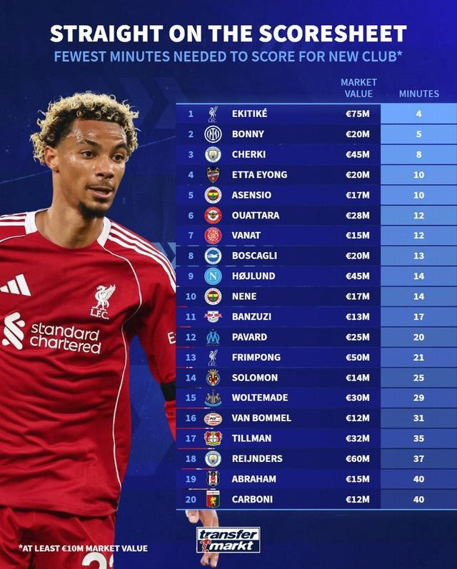 北京时间10月8日,周德统计最快球员打入下庄新赛季首球。埃基蒂奇在前四分钟内进球,排名第一,博尼落后一分钟排名第二,西尔基排名第三。埃基蒂奇在夏窗以 9500 万欧元的价格从法兰克福加盟利物浦。他在红军社区盾杯比赛开始后四分钟就攻入了利物浦的第一个进球,成为今年夏天在正式比赛中进球最快的新球员。博尼今年夏天以2300万欧元从帕尔马加盟国际米兰。国米本赛季首场意甲比赛,博尼在第68分钟替补上场,并在第73分钟进球,帮助国米以5-0领先取得开门红。今年六月,曼城斥资3650万欧元从里昂签下了中场球员切尔基。他在首场英超比赛的第74分钟替补上场,八分钟后打进了他的第一个英超进球,帮助球队他的球队以4-0击败狼队。德国新球员夏季转会费和首次进球最快时间 1. 埃基蒂奇 7500 万欧元 4 分钟 2. 博尼 2000 万欧元 5 分钟 3. 西尔基 4500 万欧元 8 分钟 4. 埃洪 2000 万欧元 10 分钟 5. 阿森西奥 1700 万欧元 10 分钟 6. 丹戈·瓦塔拉 2800 万欧元 12 分钟 7. 巴纳特 1500 万欧元 12 分钟 8.博斯卡利 2000万欧元 13分钟 9. Huylen 4500万欧元 14分钟 10.多格雷斯-内内 1700万欧元 14分钟 11.本齐 1300万欧元 17分钟 12.帕瓦尔 2000万欧元 20分钟 13.弗林蓬 5000万欧元 21分钟 14.所罗门 1400万欧元 25分钟 15.沃尔特·马德尔 3000万欧元 29分钟 16.鲁本·范博梅尔 1200万欧元31分钟 17. 马利克·蒂尔曼 3200万欧元 35分钟 18. 雷德尔斯 6000万欧元 37分钟 19. 亚伯拉罕 1500 万欧元 40 分钟 20. 瓦伦丁·卡尔博尼 1200 万欧元 40 分钟 [在 MIG 独家观看英超联赛]